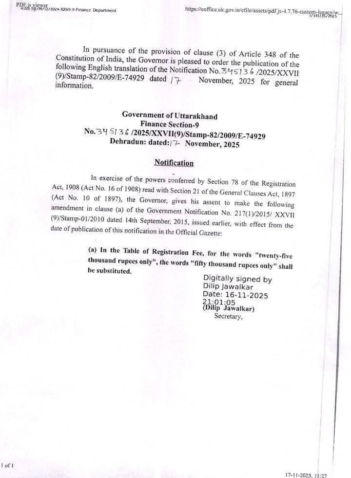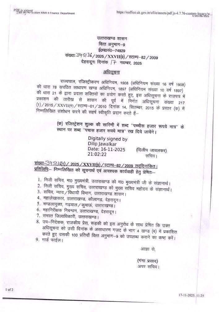 सरकार ने रजिस्ट्री शुल्क बढ़ाकर दोगुना किया; अब देने होंगे इतने रुपये, सभी जिलों को पत्र जारी