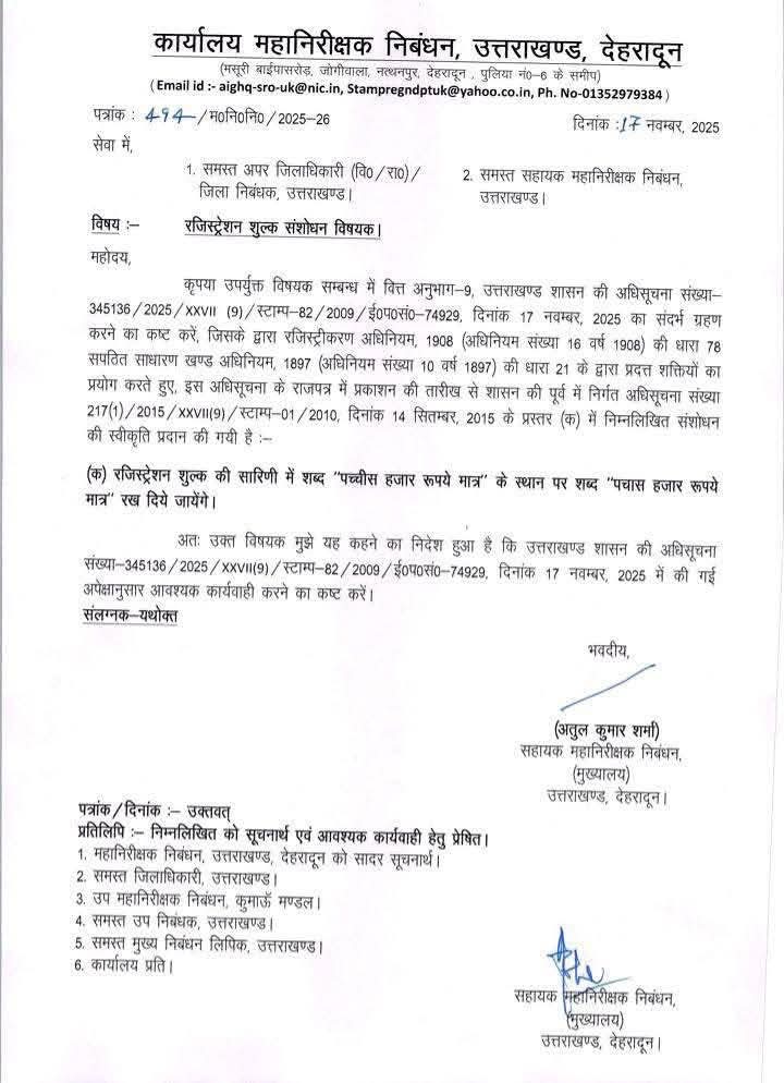 रजिस्ट्री शुल्क बढ़ाकर हुआ दोगुना, सभी जिलों को पत्र जारी