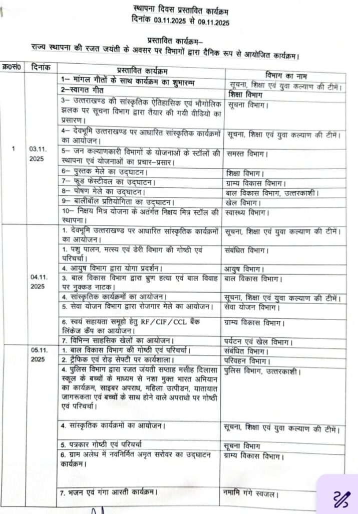 09 नवंबर को मांगल गीतों के साथ कार्यक्रम का शुभारंभ और स्वागत गीत होंगे। उत्तराखंड की सांस्कृतिक और भौगोलिक झलकियां के चलचित्र दिखाए जाएंगे। राज्य आंदोलनकारियों का संबोधन, देवभूमि उत्तराखंड पर आधारित सांस्कृतिक कार्यक्रम, विशिष्ट अतिथि का संबोधन, गंगा–यमुना छात्रवृत्ति योजना का शुभारंभ किया जाएगा। योजना दीदी पुस्तक का विमोचन किया जाएगा। राज्य आंदोलनकारियों का सम्मान कार्यक्रम, धराली आपदा में उत्कृष्ट कार्य करने वाले एन.जी.ओ. एवं कार्मिकों का सम्मान कार्यक्रम आयोजित किया जाएगा। उत्कृष्ट विद्यार्थियों का भी सम्मान किया जाएगा। विभिन्न विभागों की योजनाओं में उत्कृष्ट कार्य करने वाले व्यक्तियों का सम्मान किया जाएगा।