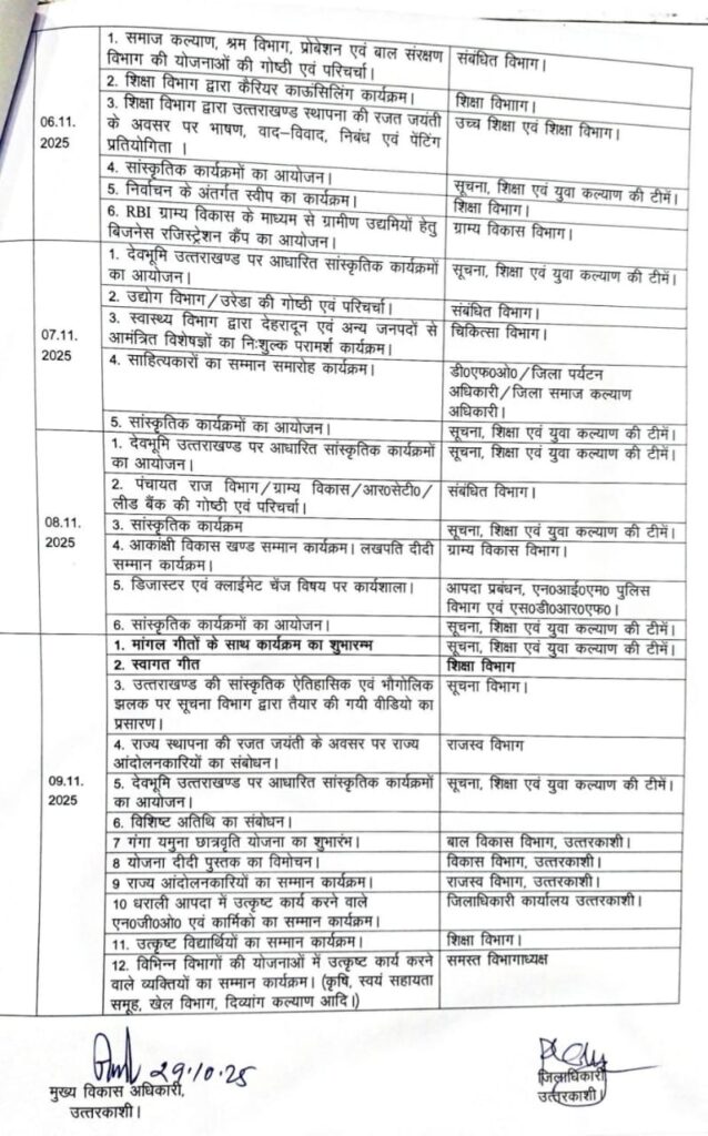 08 नवंबर को देवभूमि उत्तराखंड पर आधारित सांस्कृतिक कार्यक्रमो का आयोजन, पंचायतीराज विभाग/ग्राम्य विकास/आर.सेटी./ लीड बैंक की गोष्ठी व परिचर्चा का आयोजन किया जाएगा। आकांशी विकासखंड सम्मान कार्यक्रम, लखपति दीदी सम्मान कार्यक्रम, डिजास्टर एवं क्लाइमेट चेंज विषय पर कार्यशाला का आयोजन किया जाएगा।