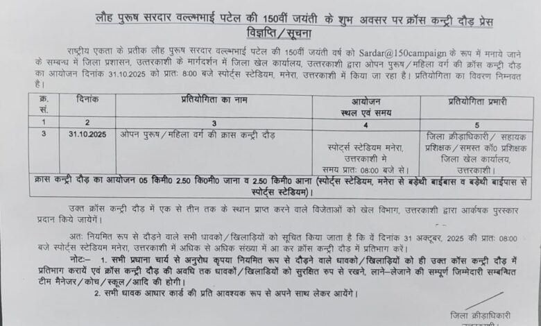 मुख्य विकास अधिकारी जय भारत सिंह ने सरदार वल्लभ भाई पटेल की जयंती एकता दिवस पर जिला मुख्यालय में होने वाली एकता मार्च/ पदयात्रा के आयोजन को लेकर बताया कि कार्यक्रम की शुरुआत सरदार वल्लभ भाई पटेल की प्रतिमा पर माल्यार्पण कर एकता मार्च/पद यात्रा रामलीला मैदान उत्तरकाशी से मुख्य प्रवेश द्वार हनुमान चौक की और से प्रारंभ होते हुए स्टेट बैंक मुख्य शाखा, सब्जी मंडी राष्ट्रीय राजमार्ग होते हुए कलेक्ट्रेट के रास्ते, विश्वनाथ चौक एवं कोर्ट रोड से होते हुए रामलीला मैदान में समाप्त होगी।