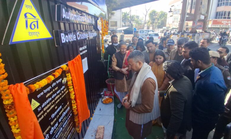 बृहस्पतिवार को नगर निगम परिसर के बाहर मेयर सौरभ थपलियाल और नगर आयुक्त नमामि बंसल द्वारा शहर की पहली ऑटोमेटेड प्लास्टिक बोतल क्रैशर मशीन का उद्घाटन किया गया।